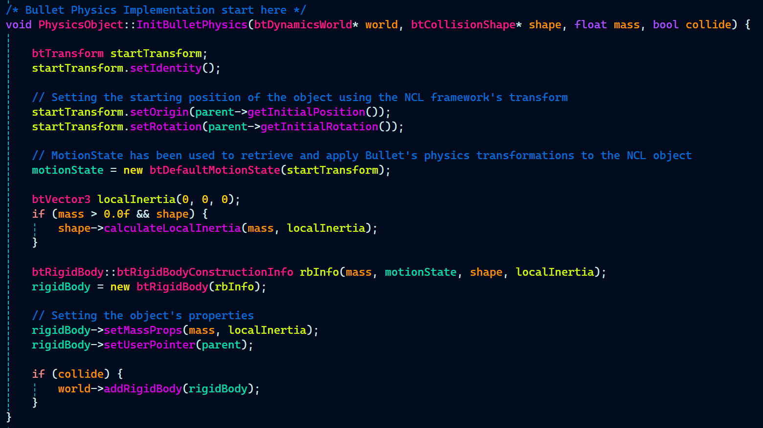 Most Importantly, it is the InitBulletPhysics function implemented in PhysicsObject.cpp that adds the game object to the Bullet’s physics world.