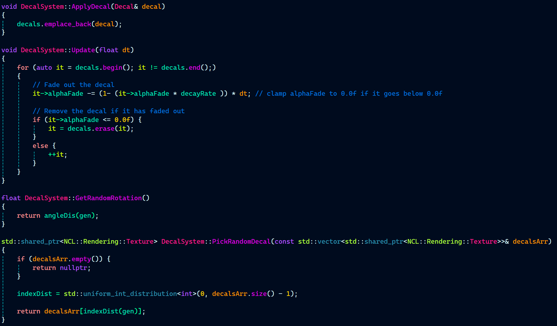 Next, I implemented ApplyDecals(), a function used by the gameplay programmer to spawn decals at the hit point of the ray. The Update function handles decal fading over time.