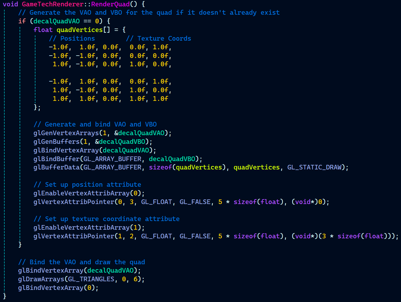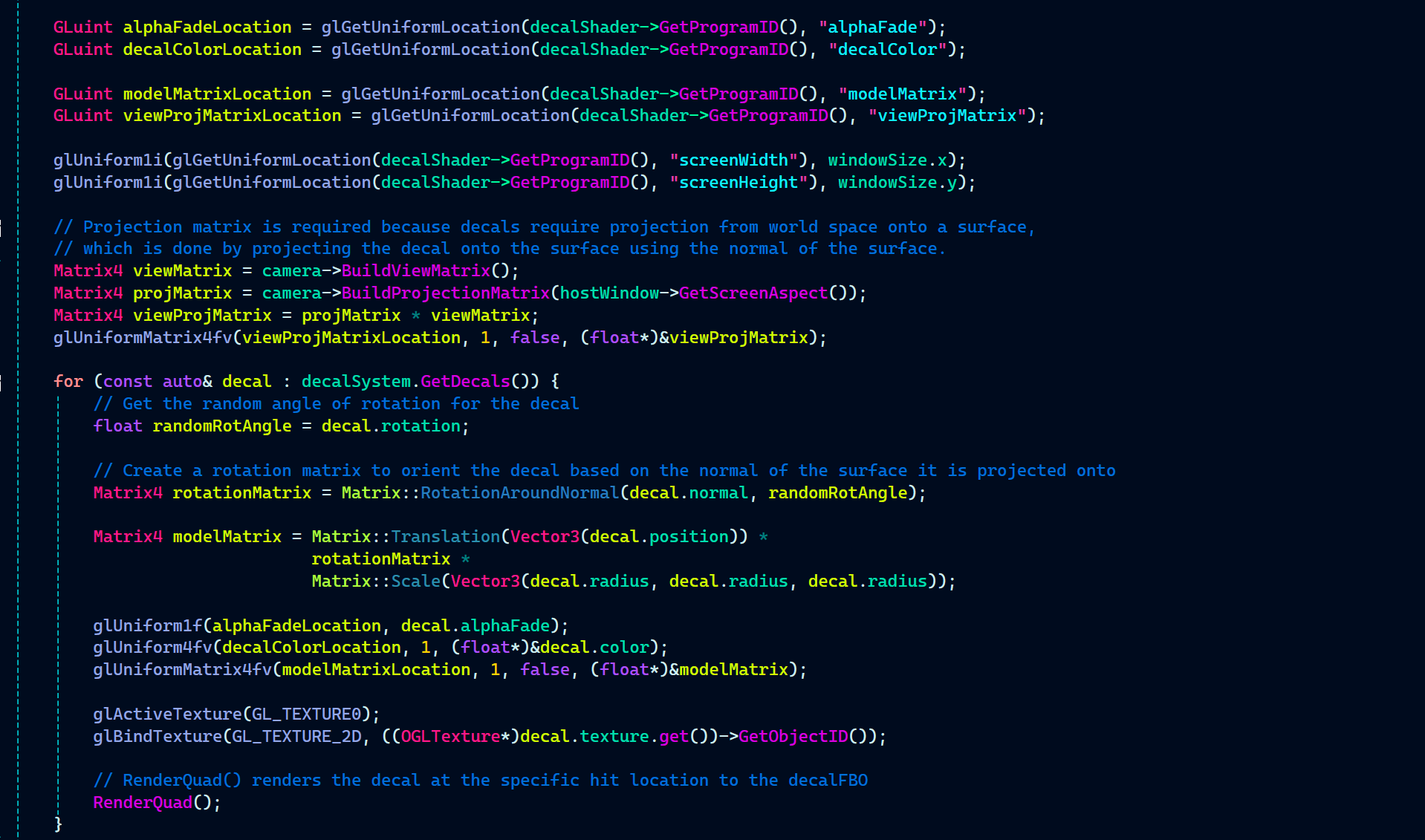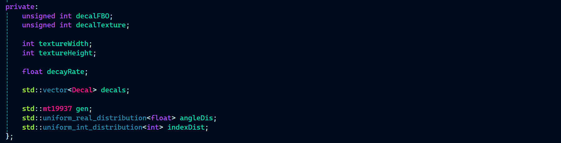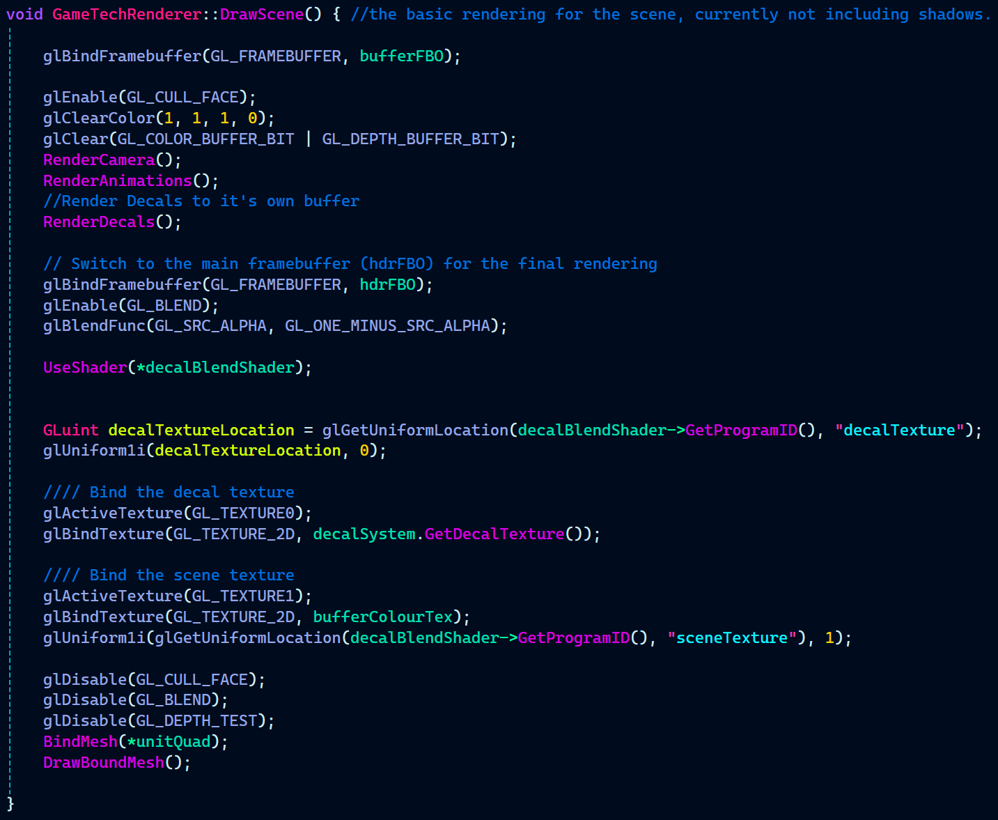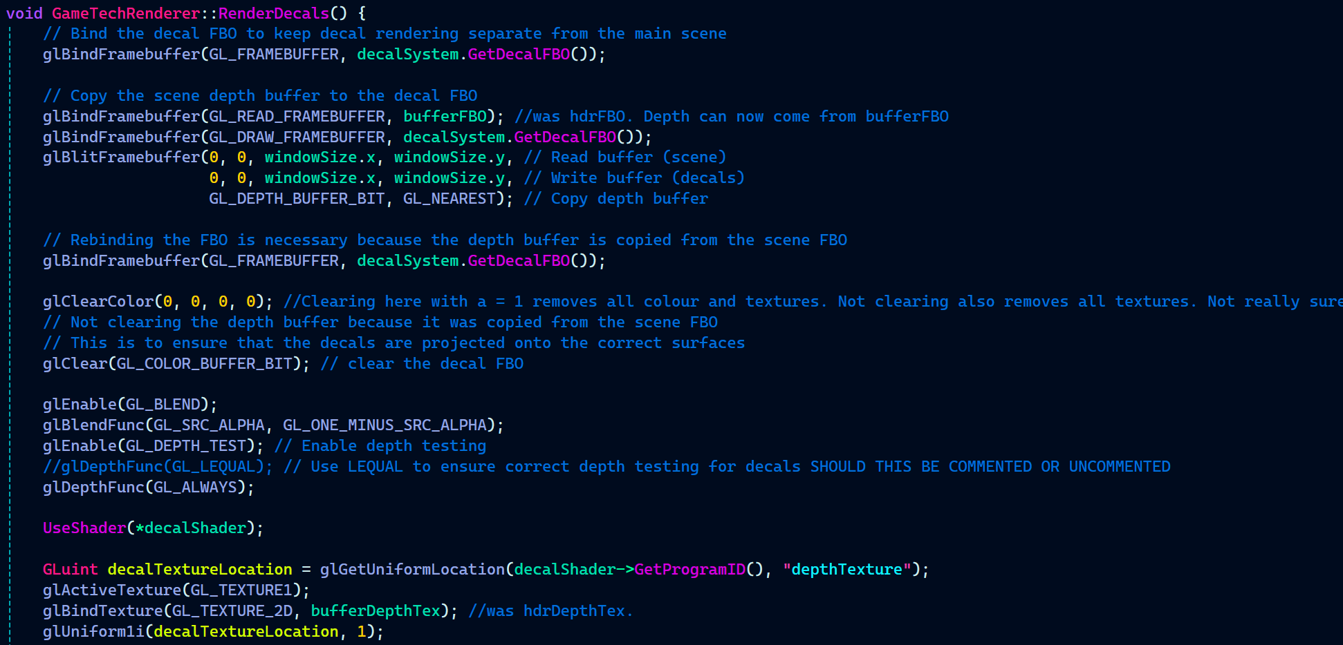 As mentioned earlier, we followed an object-oriented approach for our game engine. As a result, all decal-related functions and data were written in two files, except for the rendering part, which belongs to GameTechRenderer.cpp—the file responsible for handling everything related to rendering.