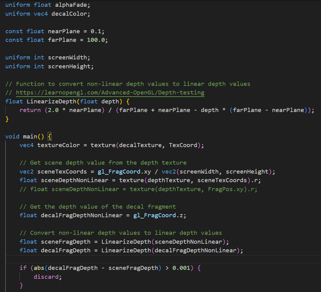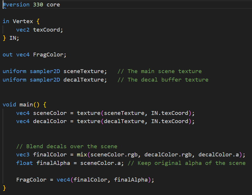 In decalBlend.frag, the scene texture and decal texture are sampled separately. The mix() function is then used to blend the decal color with the scene color, weighted by the decal’s alpha value. This allows decals to appear naturally integrated with the environment while preserving scene details.