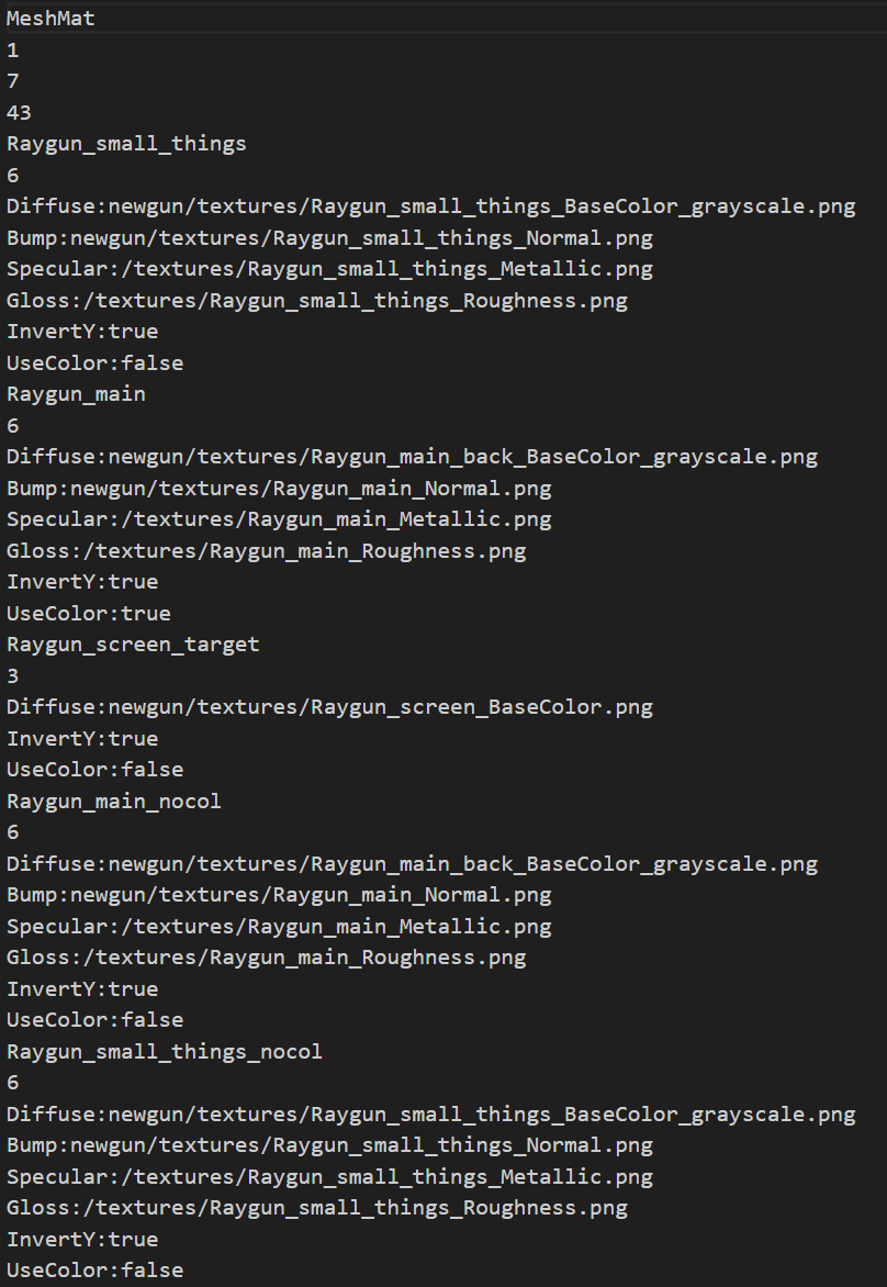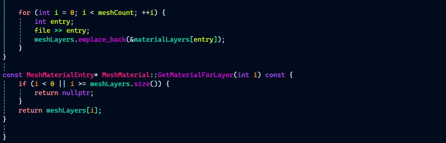 Before going further in Material constructor, let’s have a look at what MeshMaterial constructor does. MeshMaterial constructor is responsible for reading and parsing the MeshMaterial file. There’s also another function called GetMaterialForLayers which return the material for a particular layer.