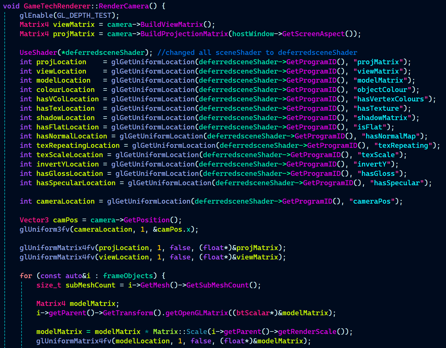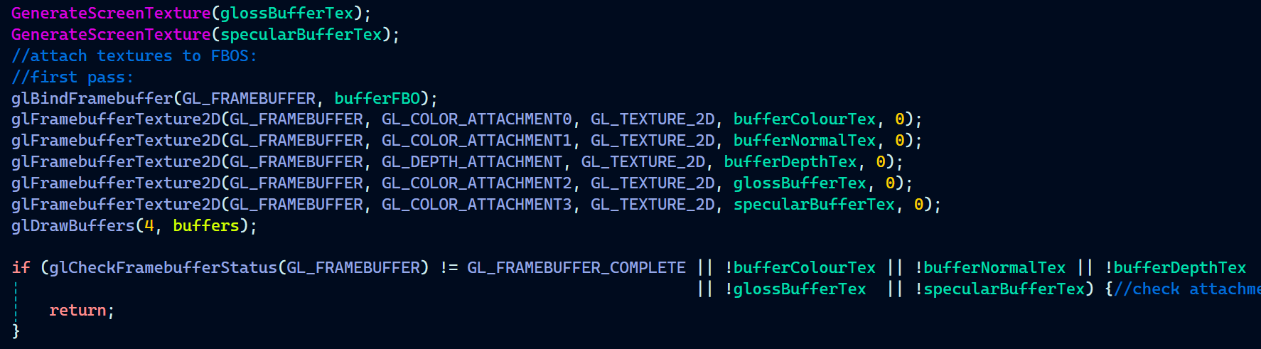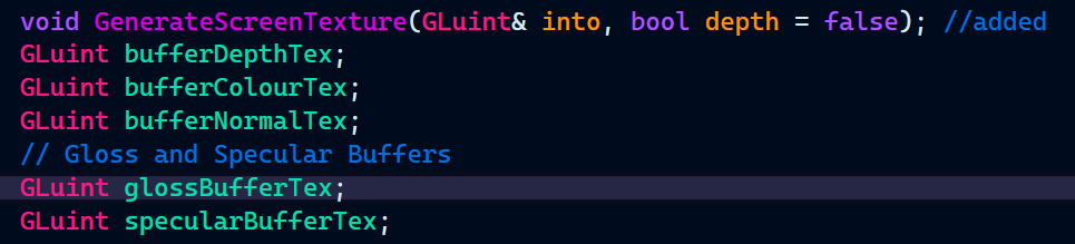 Now, in GameTechRenderer.cpp, I generated the screen textures for the gloss and specular buffers and binding them to the FBO.