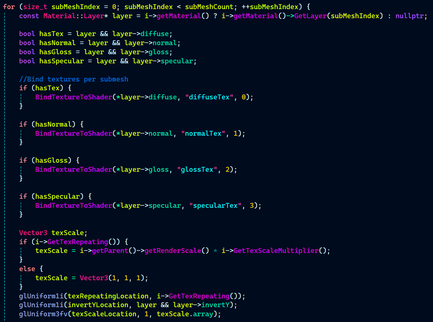 Now it’s time to send uniforms to the shader and bind the necessary textures before rendering each object.
