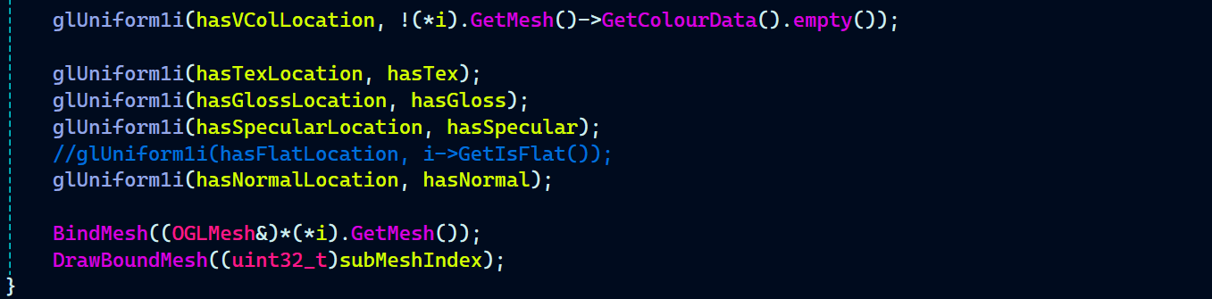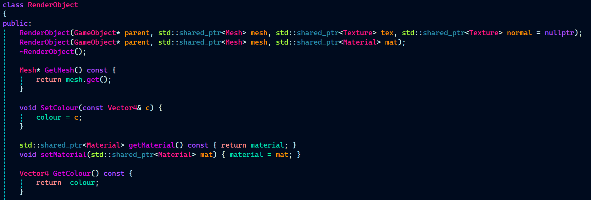 Next up in RenderObject.h, are some getter functions that returns mesh, colour, and the material. These getter functions will be use in GameTechRenderer where all the rendering stuff is handled to retrieve and set the uniforms for the shader.
