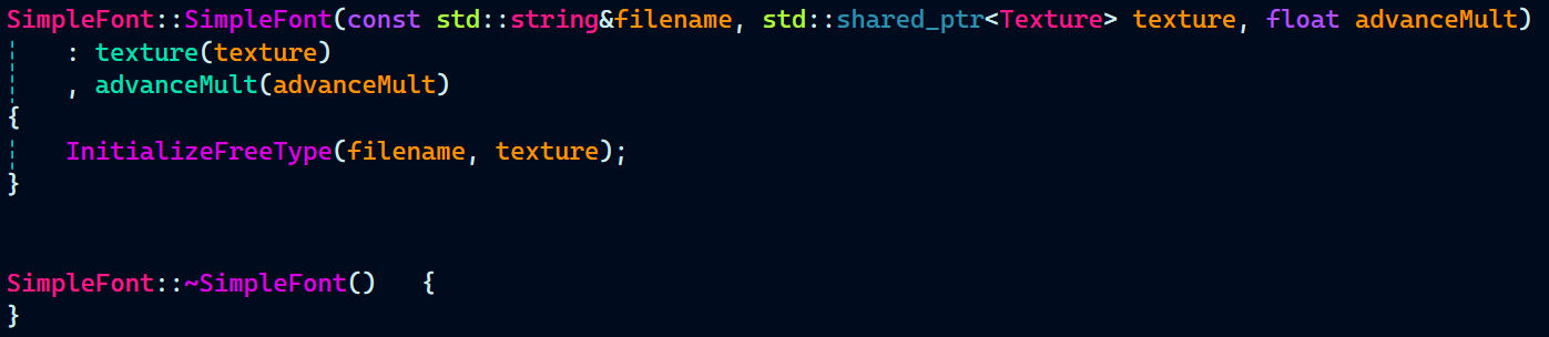 Moving on, there’s a constructor that takes a font file name, a texture to be filled with the font’s glyphs, and an advance multiplier, which controls how far the cursor moves after rendering each character.
