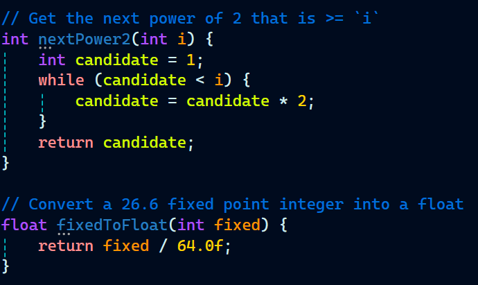 • nextPower2(int i) returns the next power of 2 greater than or equal to the input, useful for creating texture sizes compatible with GPU requirements.
