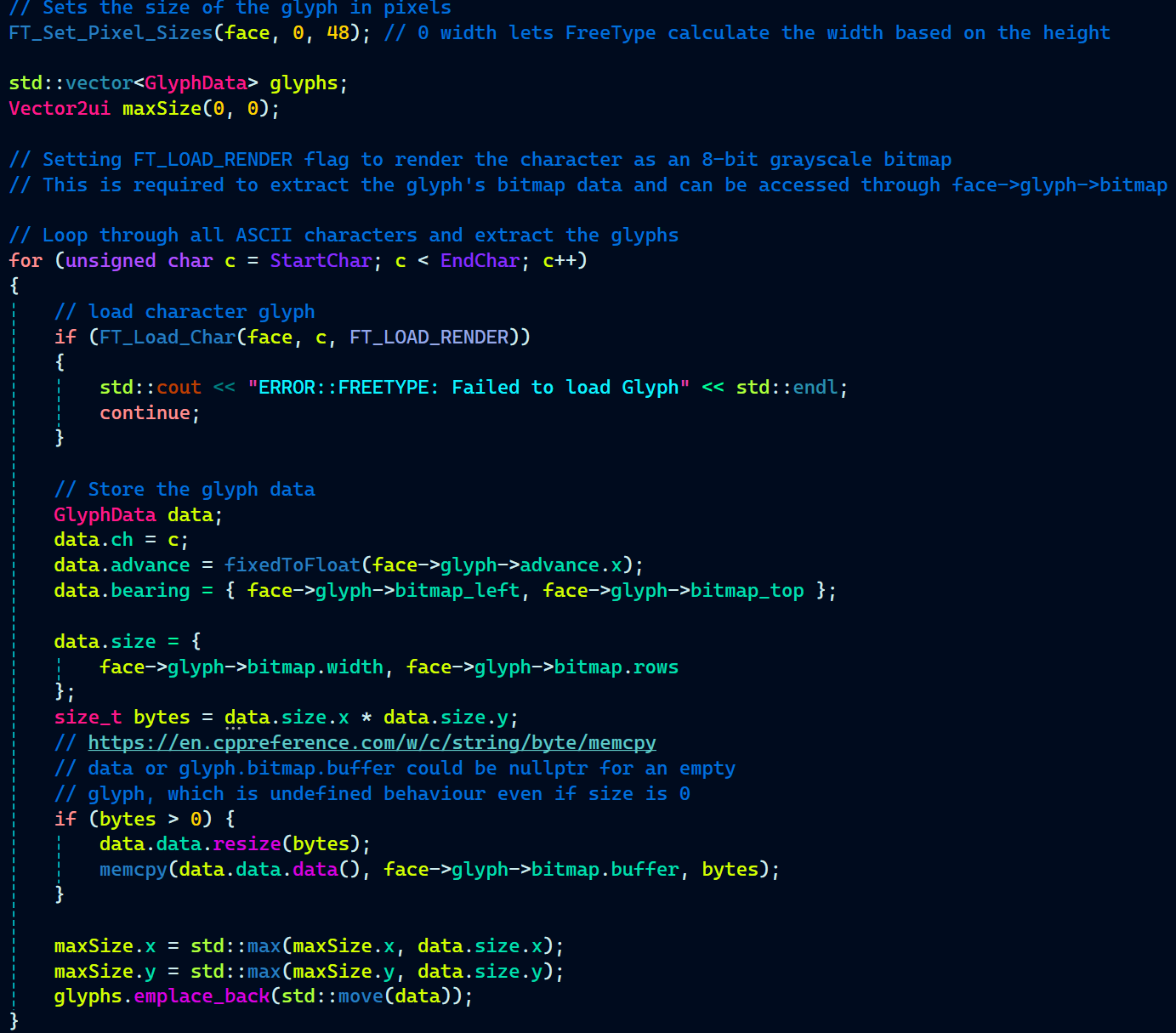 Then, it sets the size of the font’s glyphs and iterates through all ASCII characters to extract their data, including the bitmap, size, bearing, and advance. This data is stored in a GlyphData structure.