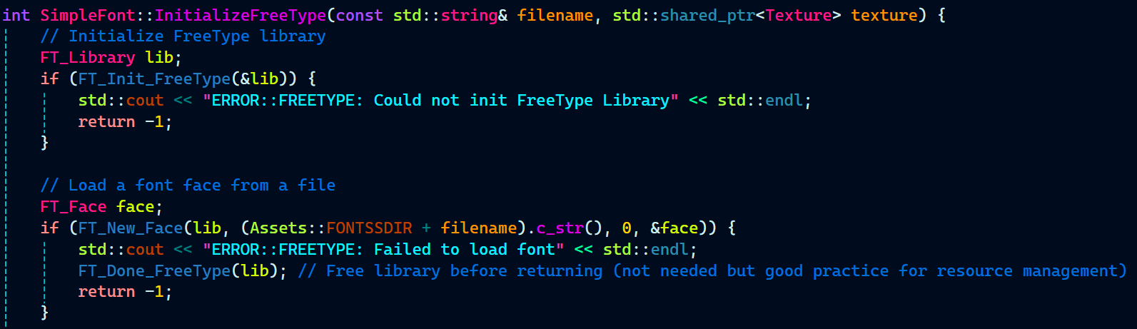 Finally, let’s look at the InitializeFreeType() function, which handles several tasks. It starts by initializing the FreeType library and loading a font face from a file.