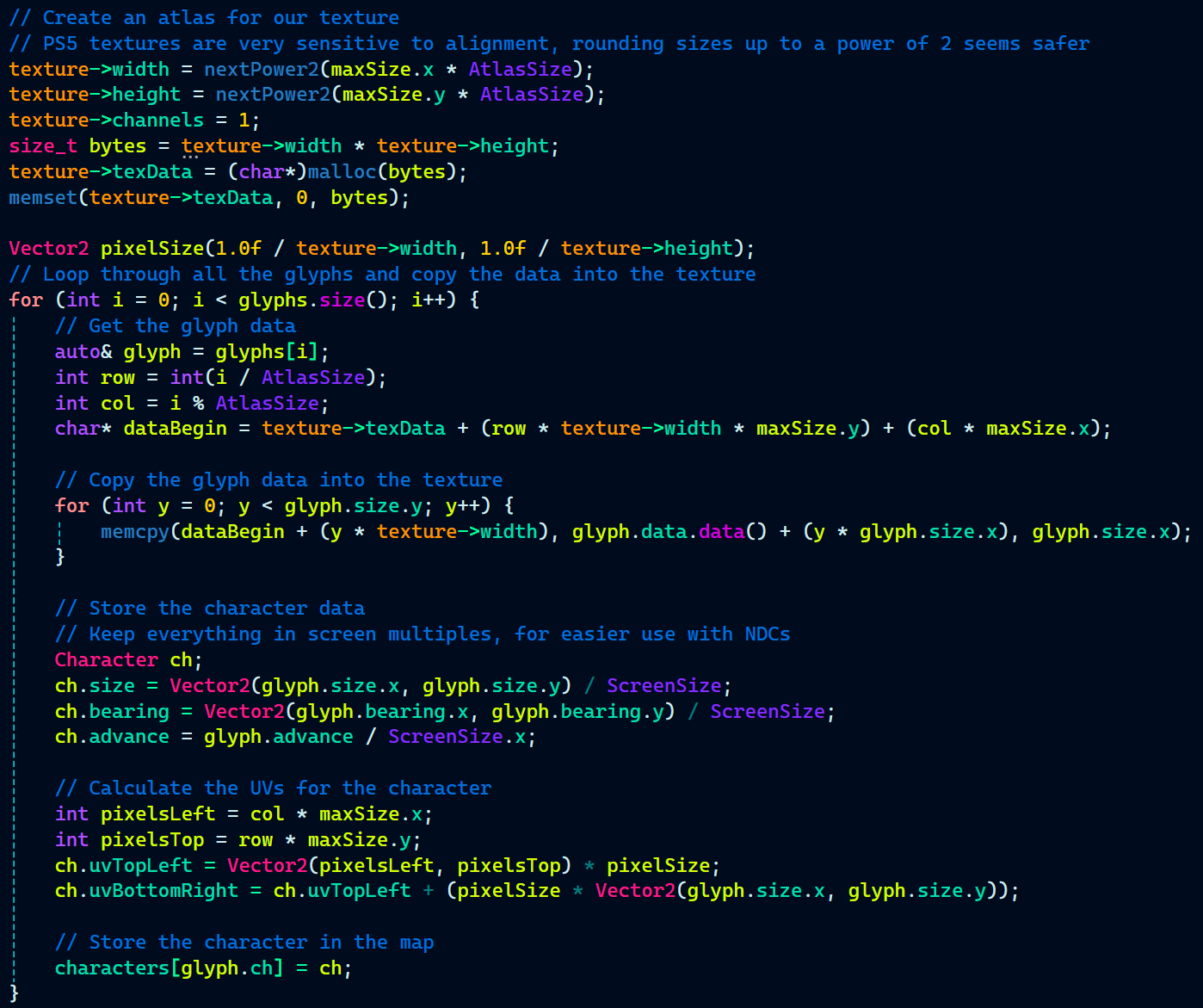 After that, it creates a texture atlas, resizing it to the next power of 2 to ensure compatibility. The glyphs’ bitmap data is copied into the texture, and UV coordinates are calculated for each character.
