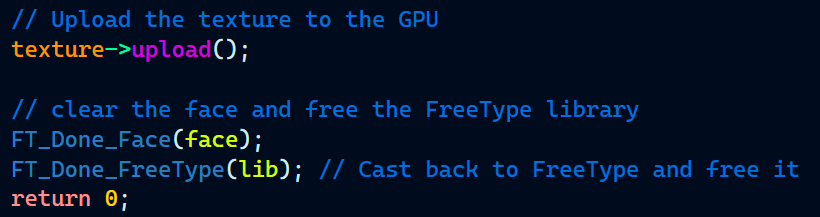Finally, the function uploads the texture to the GPU and cleans up by freeing the FreeType resources.