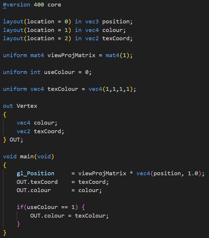 As seen in the RenderCamera() function in the GameTechRenderer.cpp that there’s a useColour bool being used to check whether the defined color by the gameplay programmer should be set to the object or not. Here’s how I defined it in the material file: