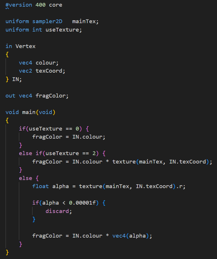 The rest of the shader code was already set up to handle the .fnt bitmap font rendering process, so it worked seamlessly with the new FreeType-based approach.