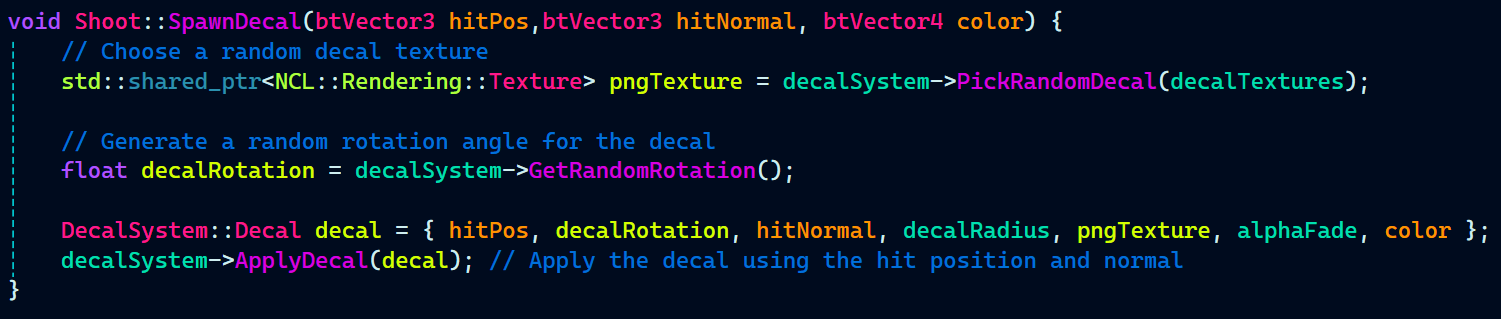 After that, a Decal struct is created with all the necessary parameters like the hit position, normal, texture, rotation, and color, and finally, ApplyDecal is called to add the decal to the system.
