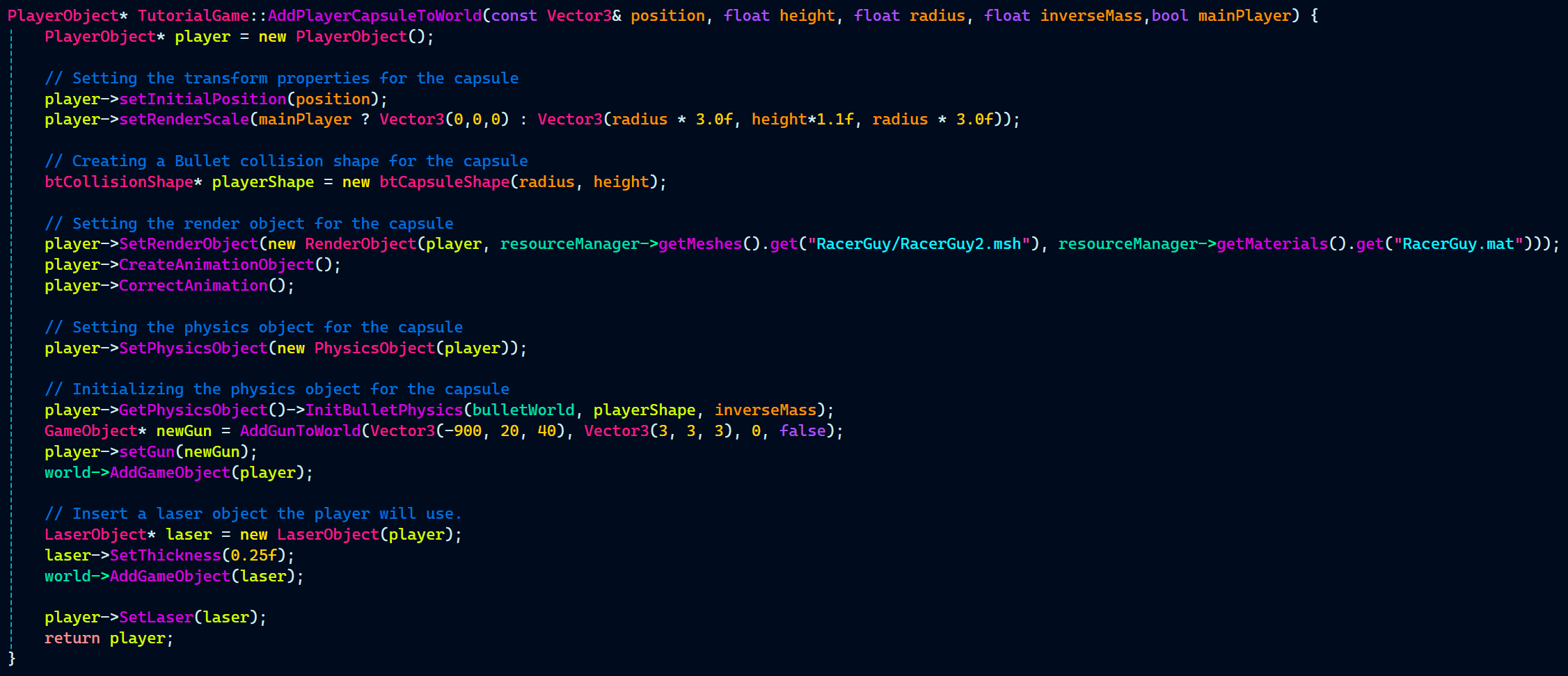 TutorialGame.cpp is the file where all the game objects are created. So, below is one example of how I added a game object to the world so that Bullet’s physics acts upon it.