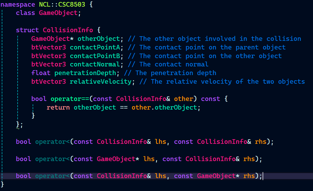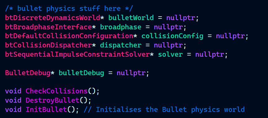 I defined the essential Bullet physics components required to initialize the physics simulation for the game objects. Also, defined some functions to initialize bullet components, destroy bullet components, and check for collisions.