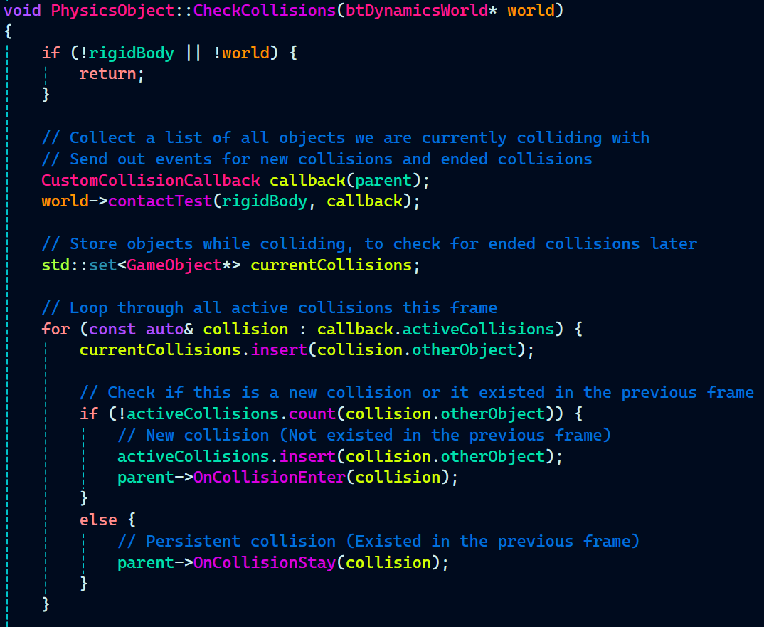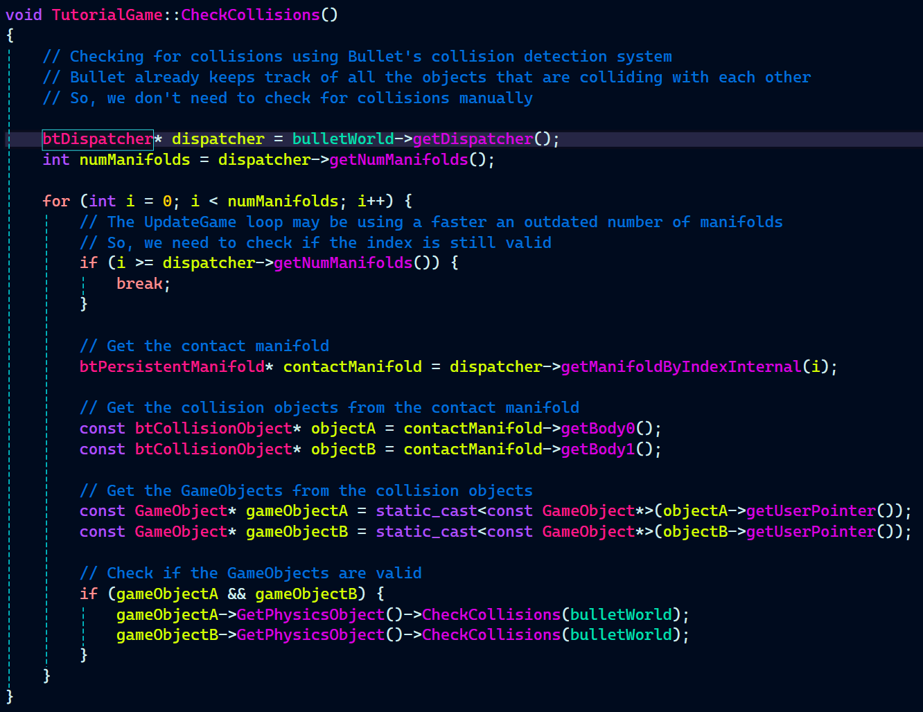Next, comes the part that I enjoyed the most while integrating Bullet with our custom game engine. This function is called CheckCollisions() and as the name suggest, is responsible for checking collision between the game objects that are active, as bullet automatically disabled inactive game objects after a while.