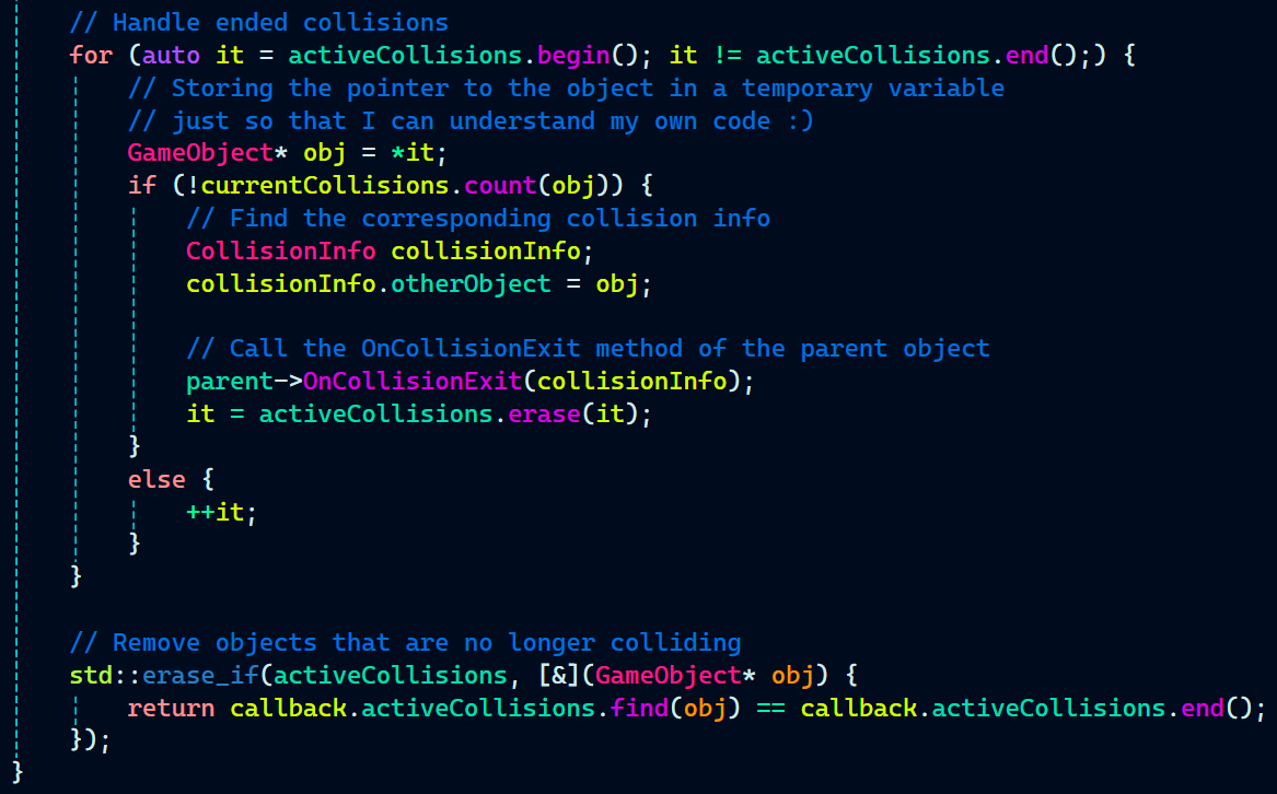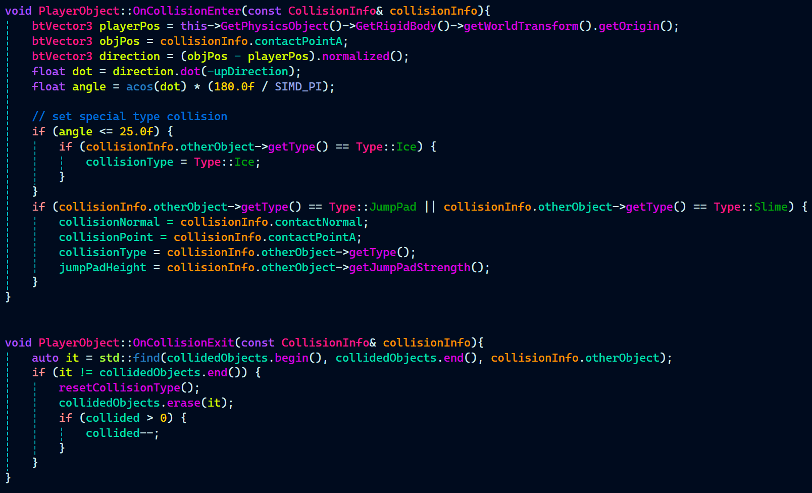 The reason this function is the best part for me is, it also includes three familiar functions that you may have seen in Unity as well. I have implemented OnCollision events like OnCollisionEnter, OnCollisionExit, and OnCollisionStay quite similar to how they are implemented in Unity.