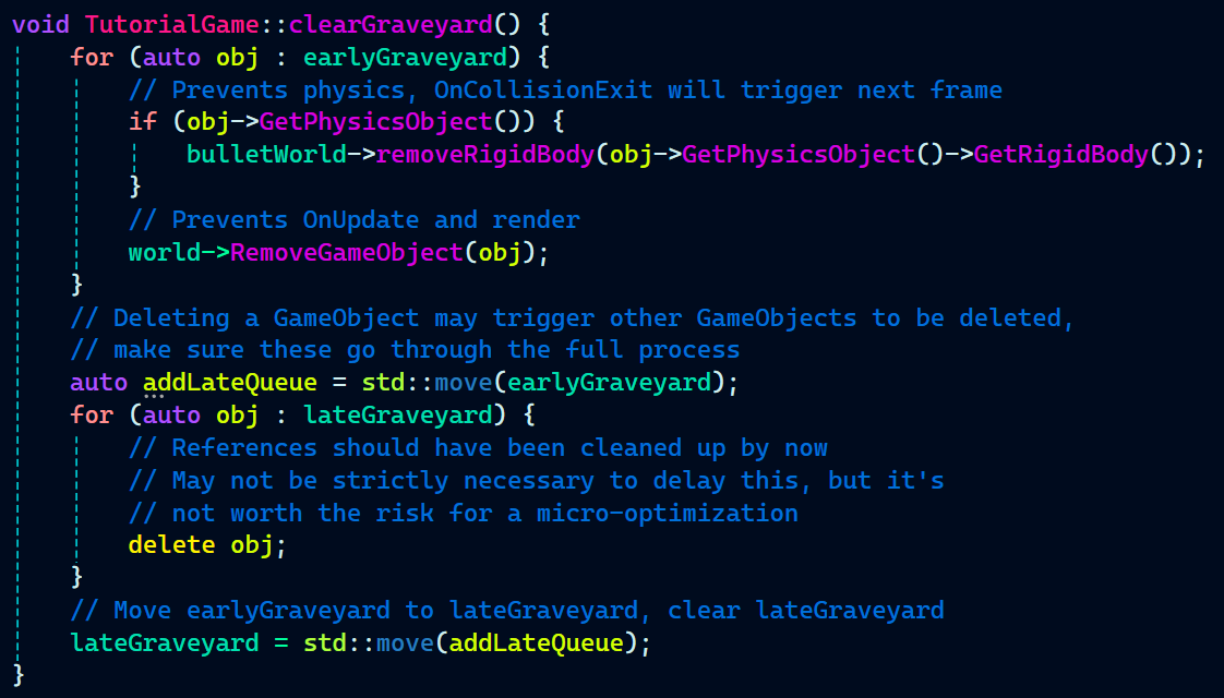 Just destroying bullet components does not remove the rigidbodies from the game objects. This has been done in the clearGraveyard() method:
