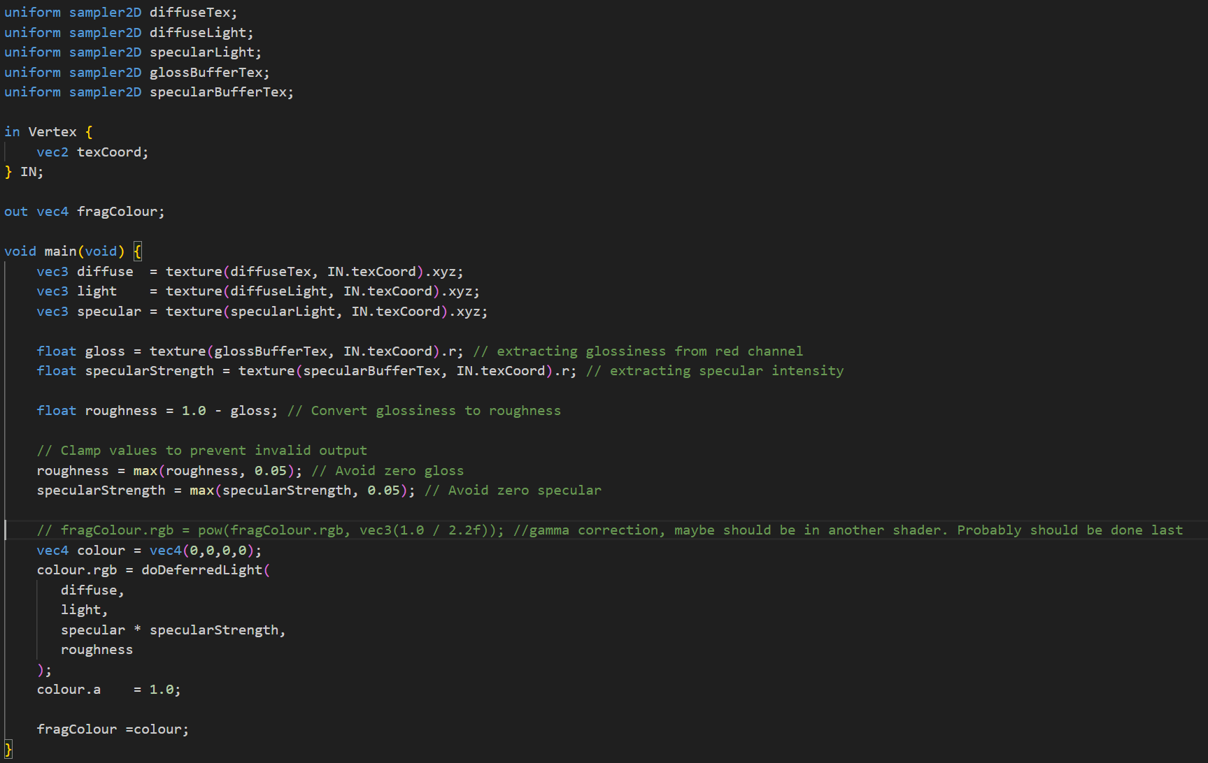 Glossiness is extracted from the red channel of the gloss buffer and converted to roughness. Specular intensity is also taken from the red channel of the specular buffer.