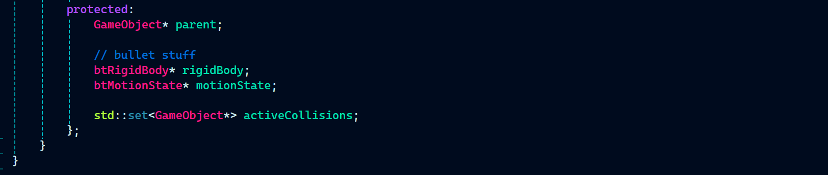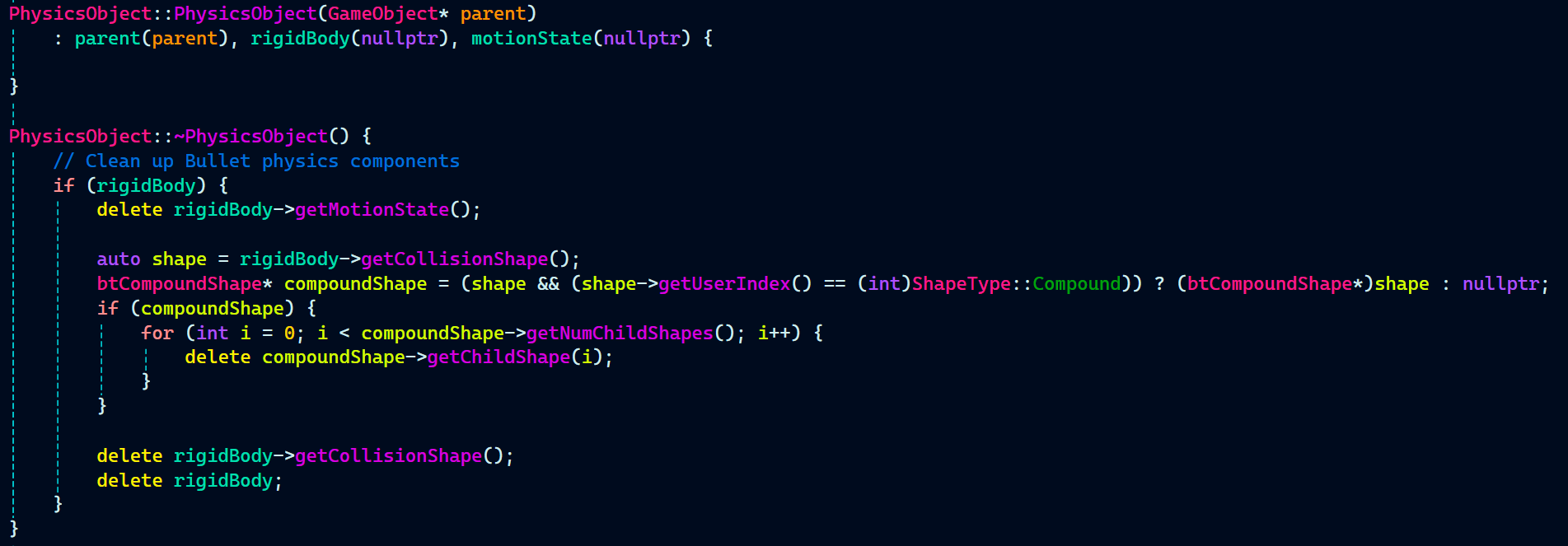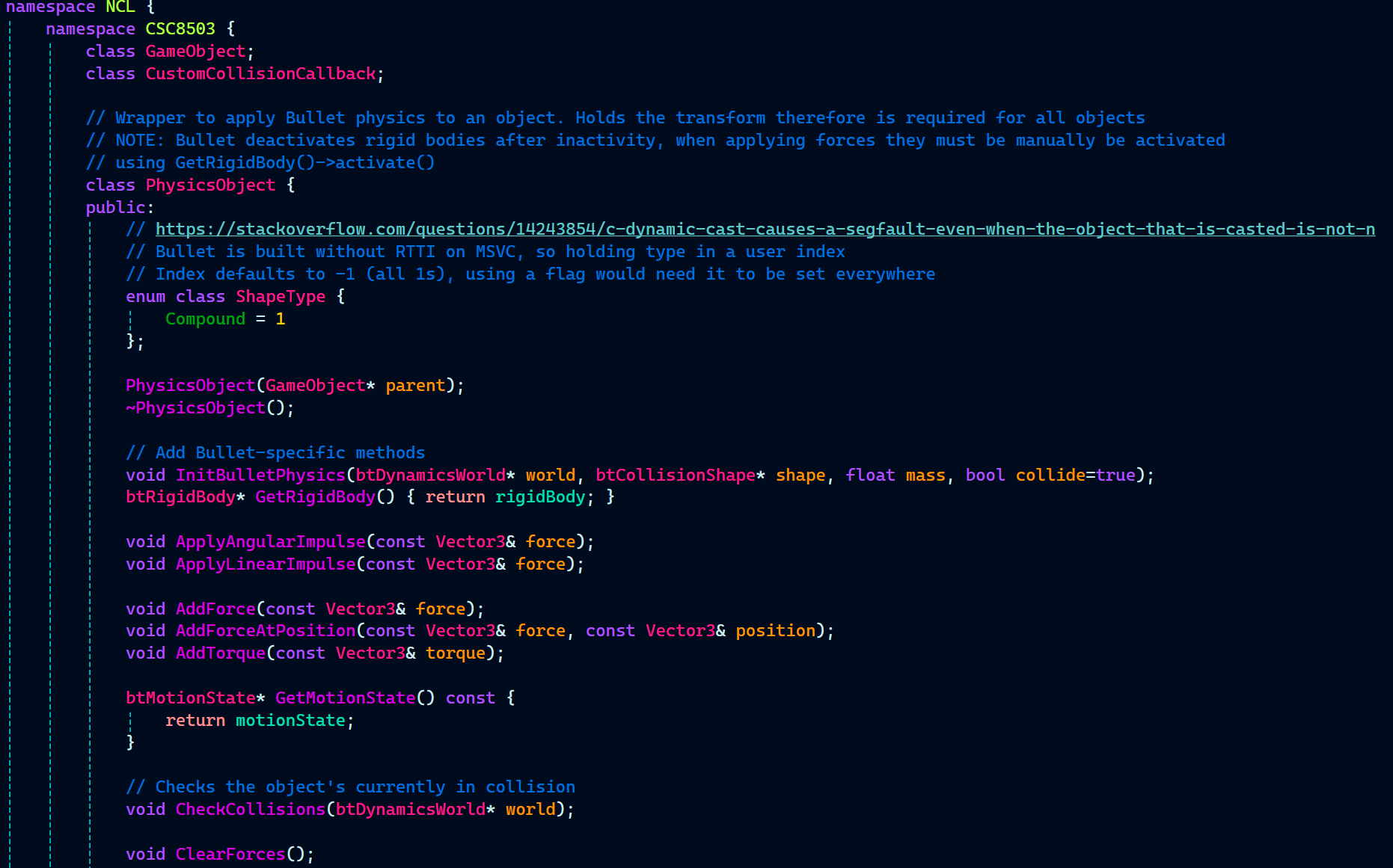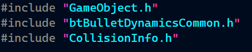 PhysicsObject header includes it’s constructor, destructor, and InitBulletPhyiscs() function. It also includes functions for physics properties that can be applied to the physics objects. Some getter functions as well a check for collisions function.