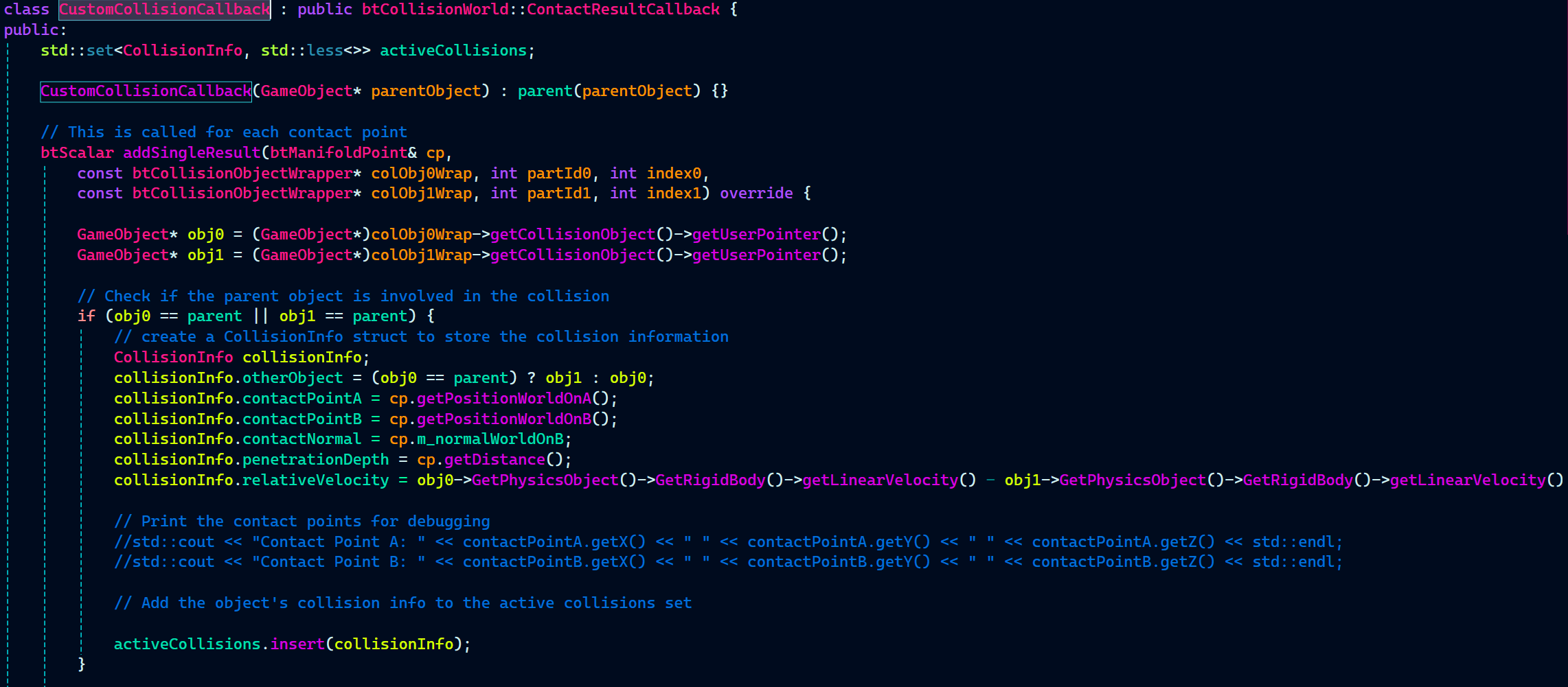 Now off to the actual stuff happening in CustomCollisionCallback. btCollisionWorld::ContactResultCallback is a Bullet Physics callback class that allows custom handling of collision results by overriding the addSingleResult function, which is called for each contact point detected in a collision test.