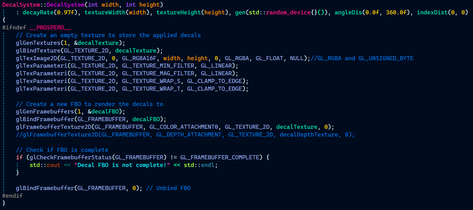 The constructor does a lot of heavy lifting for the Decal System by holding and initializing the data using an initializer list. It begins by creating a decal texture and binding it.