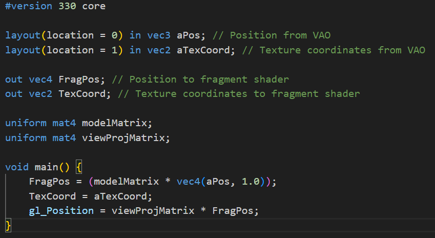 It takes in the vertex position and texture coordinates from the VAO. The position is directly assigned to gl_Position, meaning the quad will cover the entire screen. The texture coordinates are passed to the fragment shader through an output struct, ensuring the correct mapping of the scene and decal textures in decalBlend.frag.