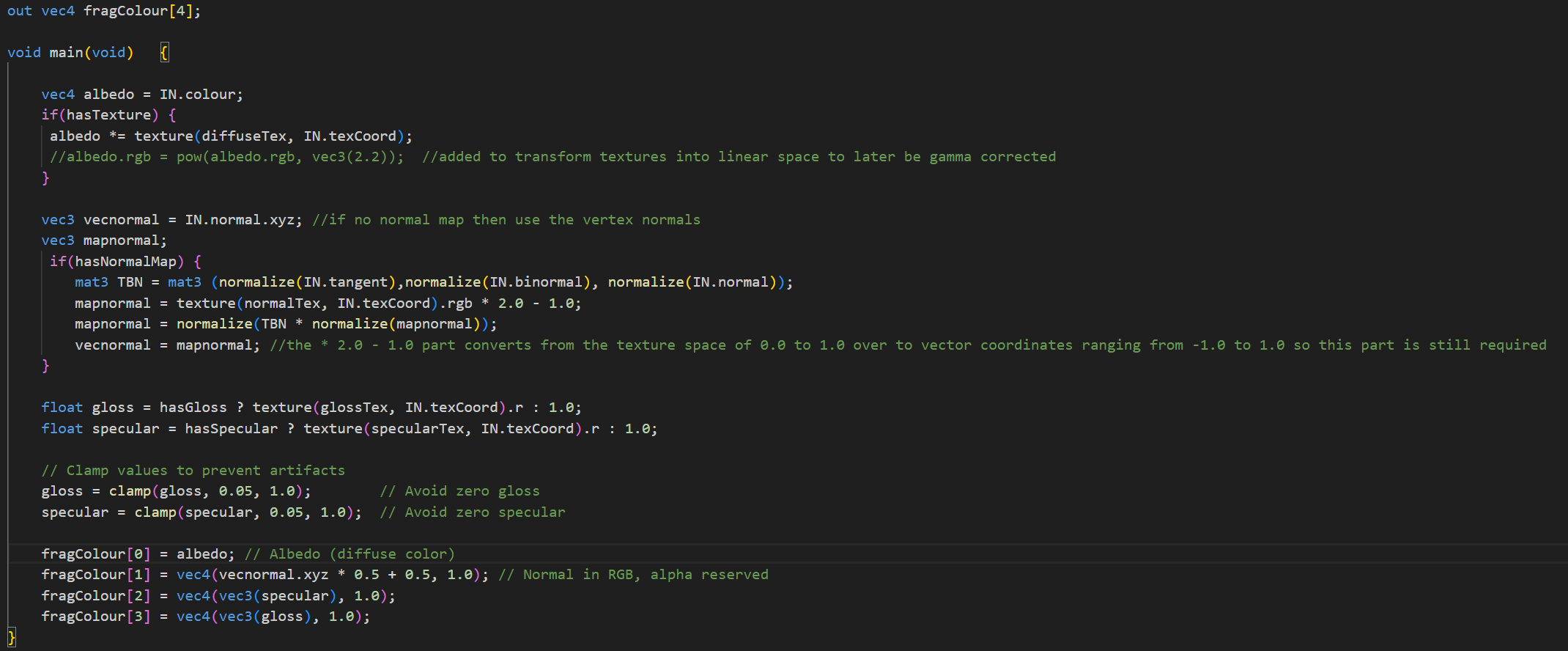 Note: Both the following shaders are written by the graphics programmer Max Davidson. I only wrote the code related to the rendering of textures extracted from the materials.