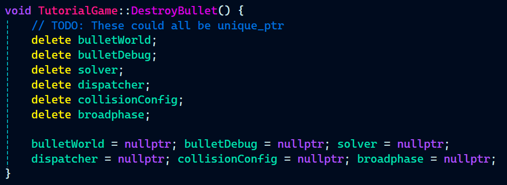 Following the InitBullet() method where I initialized all the bullet physics component, It was also important to clear all the components in order to prevent any memory leaks which has the done in the DestroyBullet method():