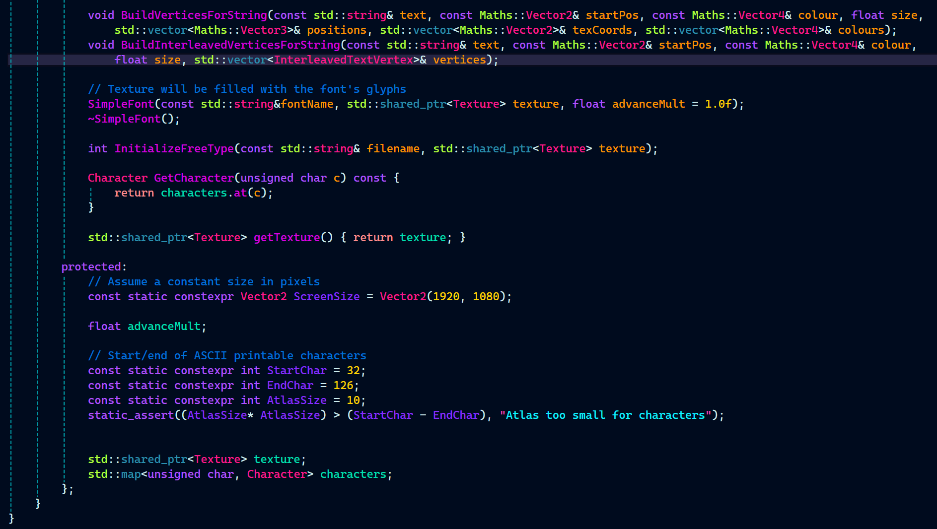 At the bottom of the class, there are a few constants and member variables to support rendering. ScreenSize defines the pixel resolution used for size calculations, while StartChar and EndChar set the range of supported ASCII characters. AtlasSize defines the font texture atlas layout and includes a static assertion to ensure it’s large enough.