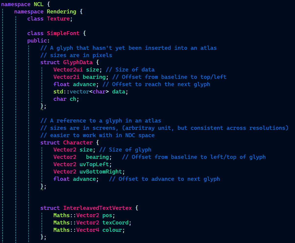 • GlyphData struct is used to store information about a glyph that hasn’t yet been inserted into a texture atlas. This includes its pixel size, bearing (which is the offset from the baseline), the advance value to get to the next character, the raw glyph data, and the character itself.