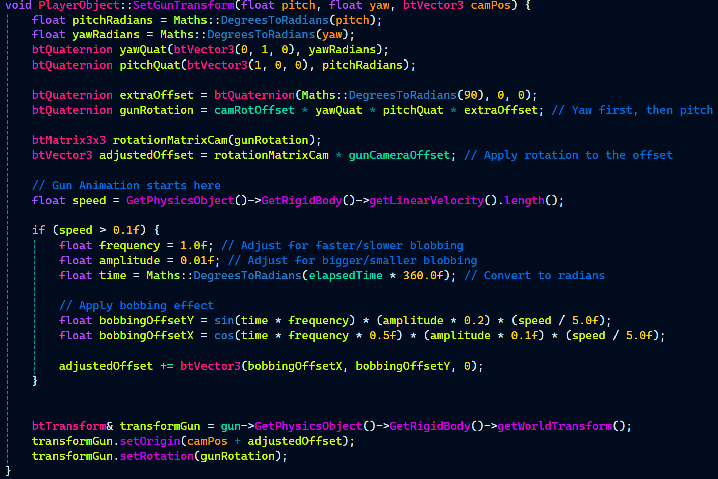 Next, the speed of the player’s movement is used to determine the intensity of the gun’s bobbing animation. If the player is moving fast enough (speed > 0.1f), the function calculates the bobbing effect based on a sine and cosine wave, adjusting the vertical and horizontal offsets of the gun. This results in the gun moving in sync with the player’s movement, giving it a more immersive feel.