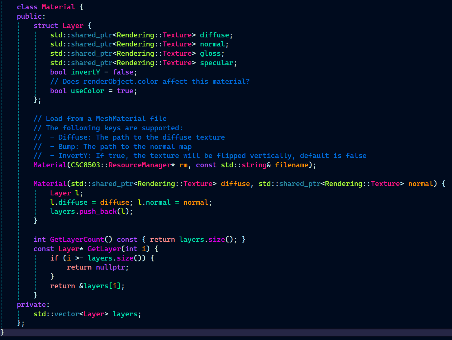 This also required a slight change to be made in the Material.h which required creating another constructor that takes in diffuse and normal textures. A layer’s diffuse and normal textures are initialized in the constructor and pushed in the layers vector array.