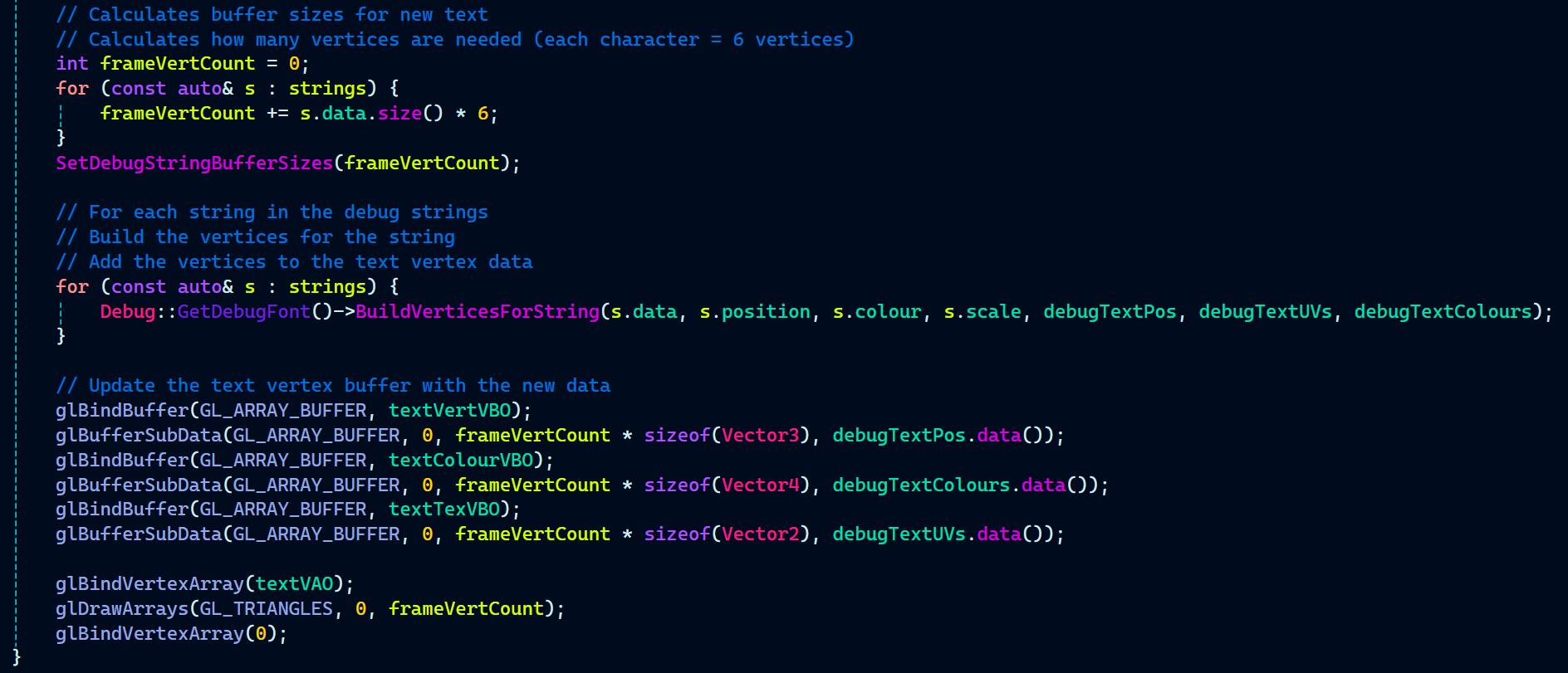 • InterleavedTextVertex struct stores the position, texture coordinate, and color data for each vertex in a rendered string. This is useful when uploading text mesh data to the GPU for rendering.