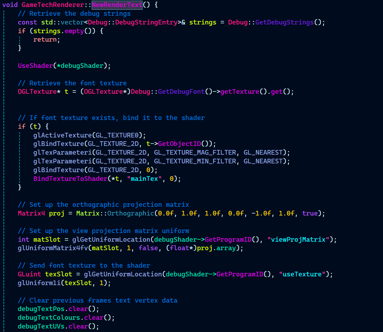 It then binds the font texture, sets up an orthographic projection matrix for text positioning, and sends the texture to the shader.